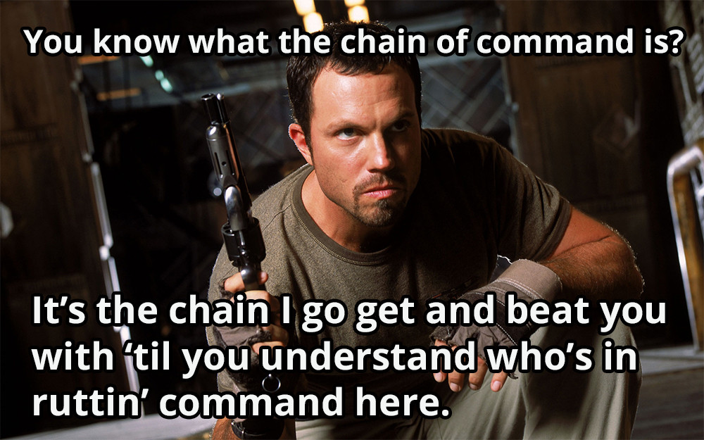 Jayne the Enforcer’s definition aside, Mal Reynolds’ use of his chain of command was done to ensure that everyone knew their roles. While he encouraged proactivity and innovation, he did not take kindly to others undermining his authority. As in when Mal locked Jayne in the airlock and threatened to toss him into space for doing exactly that.