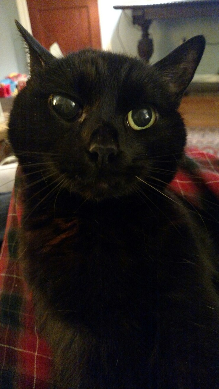 Full name: Bertram Wooster Cat, named after P.G. Wodehouse’s inimitable Bertie Wooster. He came to us four years ago, from a friend who had to get rid of him because she was moving. She mentioned he was a little odd. At first my wife – who had never before had a pet – and I weren’t sure. Then we met Bertie and his oddities, and decided we were very sure. Bertie had been hit by a car when he was little, so one eye didn’t work, he had a snaggle-toothed smile, and he was always in a perennial state of desiring closeness.