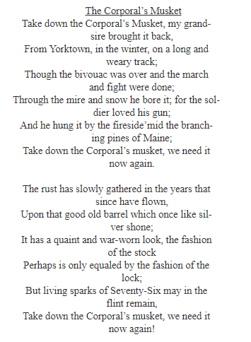 The names on the monument give a fair history of the Civil War – men killed in battle, by accident, dying of disease, or dying of wounds. George C. Getchell served in the famous 20th Maine until he volunteered to serve as an officer of United States Colored Troops a month before Gettysburg. He died of yellow fever with the 81st USCT in New Orleans in 1866. William S. Heath enlisted with his brother Francis in 1861. Prior to the war, he wrote the following poem, which illustrates the strong ties the Revolutionary generation had on New England families: